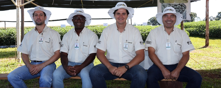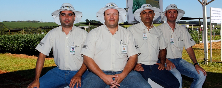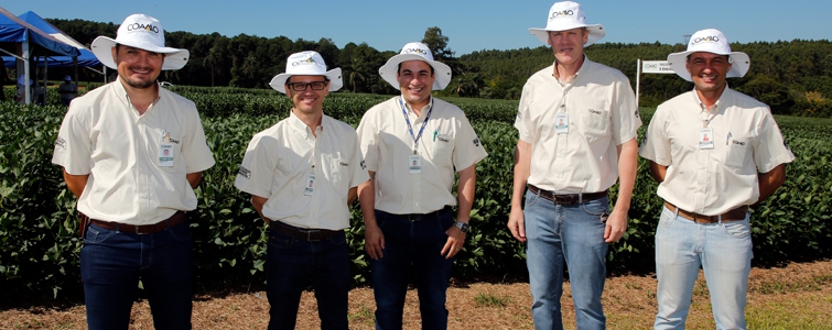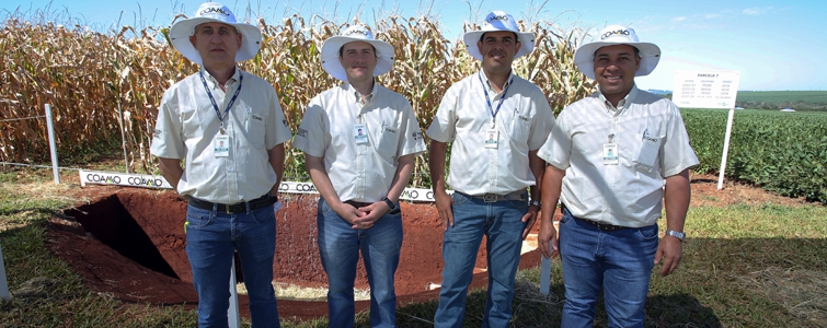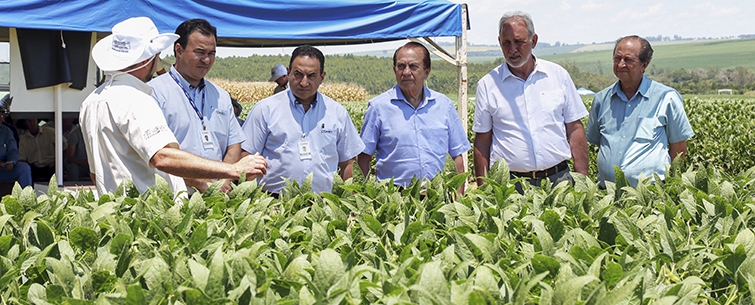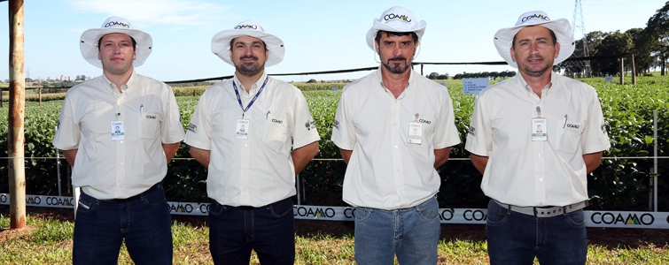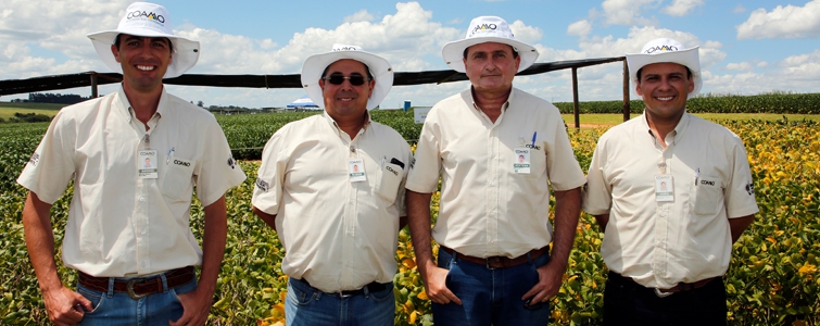 | Marcelo Sumiya, gerente de Assistência Técnica, Aquiles Dias, superintendente Técnico, José Aroldo Gallassini, diretor-presidente, Claudio Francisco Bianchi Rizzatto, diretor-vice-presidente, e Ricardo Accioly Calderari, diretor-secretário. Diretoria da Coamo apoia e participa de forma ativa de todos os encontros na Fazenda Experimental |