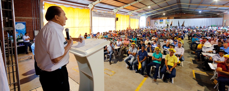 | Acima, José Aroldo Gallassini na abertura do primeiro encontro de cooperados e abaixo, durante a 30ª edição na Fazenda Experimental Coamo |