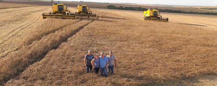A família Augusto montou uma grande operação de trabalho na Fazenda Pontal, em Amambai. Três colheitadeiras cortavam a lavoura enquanto diversos caminhões transportavam os grãos até a cooperativa, tudo acompanhado de perto pelo casal Paulo e Ana Cleida e os filhos Rodrigo e Rogério.