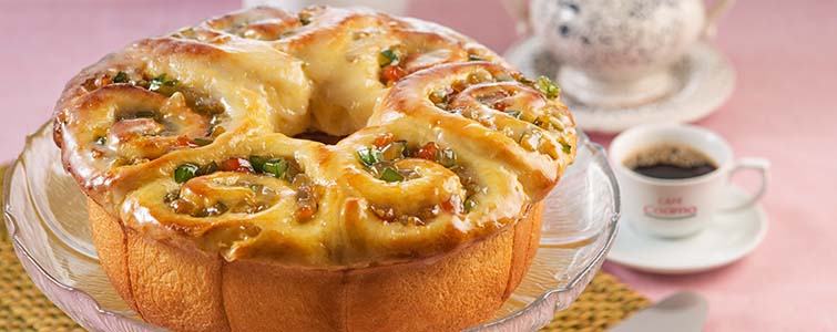 Use um rolo, mas deixe a massa grossinha. Espalhe as frutas, enrole e corte em pedaços. Coloque um pedaço ao lado do outro em forma de orifício central, untada fartamente com margarina. Deixe a parte enrolada aparecendo. Deixe crescer novamente, por 30 minutos ou mais, até ficar fofinha. Pincele e asse em forno, preaquecido a temperatura média /baixa por aproximadamente 30 minutos.