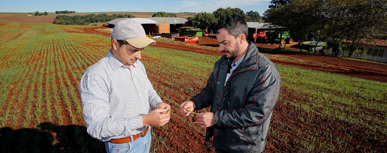 | Joelson com o agrônomo Macksuel Vinicius Coneglian: Organização facilita o trabalho na lavoura e no barracão |