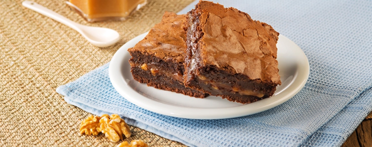 Forre uma assadeira média com papel manteiga, unte com margarina, polvilhe farinha e reserve. Preaqueça o forno a temperatura média. Preparo massa: derreta em banho-maria o chocolate picado e a margarina e reserve para resfriar. Quando a mistura de chocolate e a margarina estiver quase fria, junte os ovos, um de cada vez, batendo bem com batedor de arame ou espátula. Acrescente o açúcar e misture novamente. Em outra vasilha, peneire juntos o cacau, a farinha e o sal. Junte a mistura de chocolate e misture bem. Coloque metade dessa mistura na assadeira e espalhe. Cubra, com cuidado, com uma camada de doce de leite por cima. Salpique as nozes. Finalize com o restante da massa de chocolate, espalhando bem com uma espátula. Leve ao forno baixo por 40 minutos, aproximadamente. O brownie deve sair ligeiramente úmido. Deixe esfriar e corte em quadrados para servir.