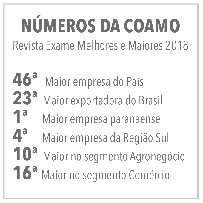 Os números da edição Melhores e Maiores 2018 da revista Exame são comemorados com orgulho pela diretoria, cooperados e funcionários. Mesmo com a queda dos preços que reduziu a rentabilidade, a performance apresentada no anuário da Exame reflete a solidez da cooperativa na sua atividade. O engenheiro agrônomo, idealizador e presidente da Coamo, José Aroldo Gallassini afirma que a força do trabalho, da união e do profissionalismo dos mais de 7.500 funcionários impulsiona o crescimento e o sucesso dos mais de 28 mil cooperados e da cooperativa. “Ficamos felizes em ver esse reconhecimento à Coamo, comemoramos e partilhamos esses bons resultados com todos da família Coamo. Temos orgulho de ser do campo, do Brasil e exportar nossos produtos para o mundo, com a certeza de que a Coamo é uma empresa séria, bem administrada e profissionalizada, voltada para a prestação de produtos e serviços de qualidade em prol do desenvolvimento dos seus associados”, explica.