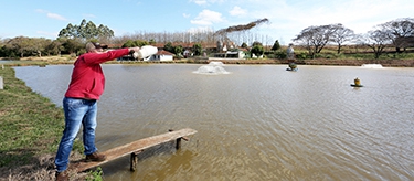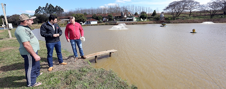 | Cooperados Irineu Toiller e Valdecir Luiz Ferster utilizam Rações Coamo para o trato dos peixes. Trabalho conta com assistência do médico veterinário da Coamo, Cezar Augusto Pante Neto |