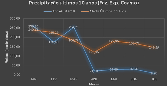 Os dados de precipitações da Fazenda Experimental da Coamo, em Campo Mourão, mostram que os meses de abril, maio, junho e julho, ficaram abaixo da média de chuva nos últimos dez anos. Nestes meses as fases de desenvolvimento da cultura na área de ação da Coamo, passavam por vegetativo, florescimento e frutificação, e a falta de água contribuiu negativamente para a cultura.