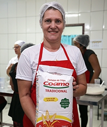 | VANDA MARIA TONHATO: “Este curso está sendo ótimo. Estamos aprendendo muito. Sem contar, que utilizamos alimentos de ótima qualidade. Os Alimentos Coamo de fato fazem a diferença no produto final. Os pães ficam branquinhos e macios.” |
