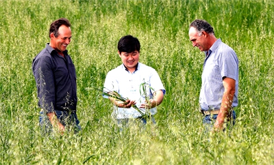 Com o agrônomo Marco Guenca, da Coamo, os Rickli conferem qualidade da aveia, que cobre parte da área da fazenda, onde será cultivado soja em breve.