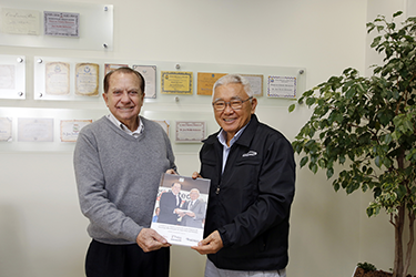 Dr. Aroldo recebe de Jiro Nishimura, uma homenagem em agradecimento a ele ter sido patrono da 3ª turma do curso superior de Mecanização em Agricultura de Precisão (MAP), mantido pela Faculdade de Tecnologia de Pompeia – Fatec Shunji Nishimura. |