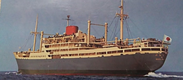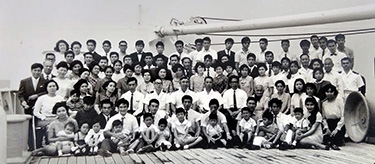 | No destaque, "seo" Terumi, com o grupo de imigrantes, em 1968, no navio Brazil - Maru |