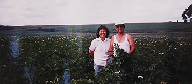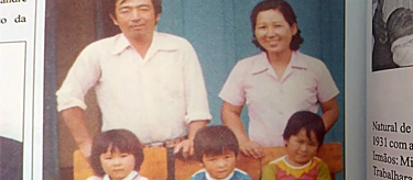 | Casal Kesao e Mituko, em 1980, em uma das lavouras de batata cultivadas em Pinhão, e ao lado com os filhos Cristina, Eduardo e Cláudio |