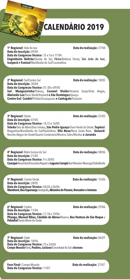 As fases regionais serão realizadas de 27 de abril a 06 de julho compreendendo 33 etapas que irão classificar os 33 campeões para participar no dia 27 de julho da grande final da Copa Coamo em Campo Mourão.