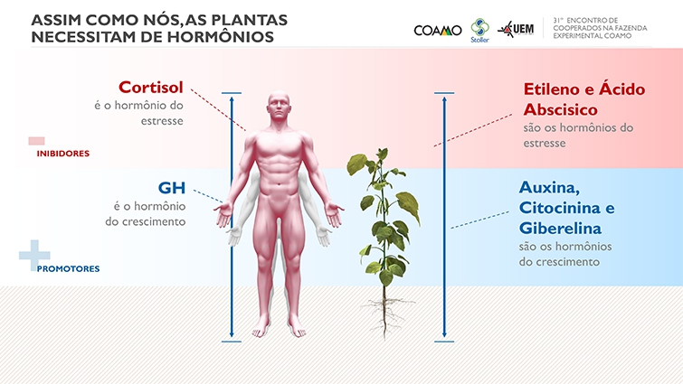 Professor e pesquisador da UEM, da área de Nutrição de Plantas, Tadeu Takeyoshi Inoue, diz que quem faz todo o comando para utilização das condições do ambiente, reguladas por água e luz solar são os hormônios. “A planta possui hormônios promotores e inibidores, regulados geneticamente por cada material que respondem às alterações climáticas. O que fazemos é equilibrar toda esta genética de acordo com o ambiente em que a planta se desenvolve”, destaca Inoue. Ele garante que em período de curto estresse é possível fazer com que a planta mantenha uma atividade metabólica de crescimento alta. “O objetivo de tudo é fazer com que a planta suporte melhor as variações de clima, para ter um melhor desempenho em produtividade. Mas, tudo deve ser feito com critério e acompanhamento técnico”, orienta.
