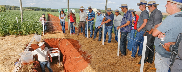 Mostrar ao produtor a importância do aspecto físico do solo, esclarecendo de que forma essas condições influenciam diretamente nas produtividades que podem ser alcançadas. Com este objetivo, uma das dez estações montadas no encontro, apresentou fatores que estão ligados a taxa de infiltração de água pelo solo e, consequentemente, a disponibilidade para a planta. “Mostramos de forma bem prática, consistente e dinâmica, como o cultivo que o cooperado adota influencia diretamente nesta taxa de infiltração. Dependendo do sistema pode ser mais ou menos eficiente em absorver a água da chuva e deixá-la disponível para a planta”, explica o engenheiro agrônomo Fabrício Bueno Corrêa, da Coamo em Campo Mourão (Centro-Oeste do Paraná).