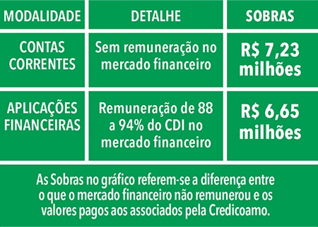 O valor das sobras distribuídas pela Credicoamo na proporção da movimentação de recursos disponíveis em contas correntes e aplicações financeiras dos associados, proporcionaram um rendimento, equivalente a 110% do CDI, superior à remuneração média do mercado, conforme quadro demonstrativo ao lado.