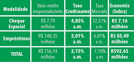 Considerando as taxas médias de juros do ano 2018, divulgadas pelo Banco Central do Brasil, a Credicoamo gerou um benefício direto e expressivo para os associados que contrataram empréstimos com recursos livres ou utilizaram-se do limite do cheque especial, representando uma economia de R$ 92,65 milhões.