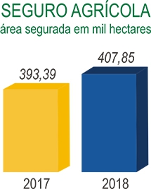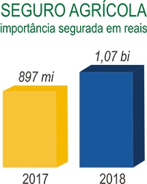 Destaca-se também o expressivo volume de seguro agrícola contratado em 2018, com importância segurada de R$ 1,07 bilhão, para uma área de 407.852 hectares e 5.245 apólices.