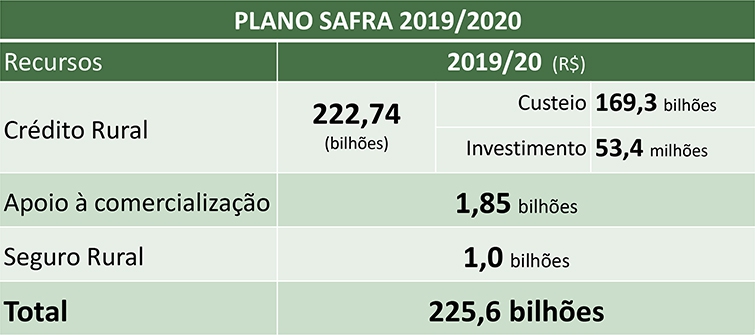 O governo anunciou no dia 18 de julho durante cerimônia no Palácio do Planalto, a liberação de R$ 225,59 bilhões em financiamentos por meio do Plano safra 2019/2020 para os pequenos, médios e grandes produtores. O valor é pouco acima dos R$ 225,3 bilhões anunciados na safra passada. A liberação dos recursos do plano agrícola começará em julho e seguirá até junho do ano que vem.