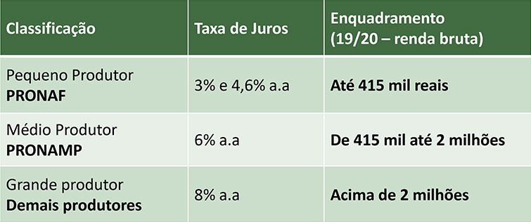 O Ministério da Agricultura informou que as taxas de juros, para custeio, comercialização e industrialização, serão de: 3% e 4,6% ao ano para pequenos produtores, participantes do Programa Nacional de Fortalecimento da Agricultura Familiar (Pronaf); 6% ao ano para os médios produtores; 8% para os grandes produtores.