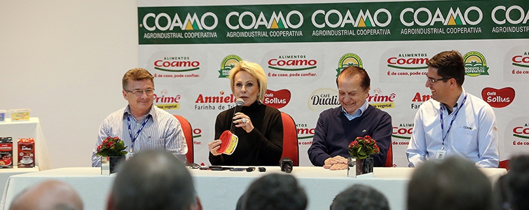 Centenas de associados e associadas tiveram uma surpresa no dia 18 de julho, em Campo Mourão, durante o Encontro de Inverno da Fazenda Experimental Coamo, com a presença da apresentadora e embaixadora dos Alimentos Coamo, Ana Maria Braga. Na oportunidade ela falou com os participantes e, logo após, conheceu o Parque Industrial da Coamo e a Administração Central. Sobre a parceira com a Coamo, Ana Maria Braga diz que começou quando recebeu uma carta do presidente da Coamo, José Aroldo Gallassini e se emocionou muito com todas as lutas e conquistas da cooperativa.