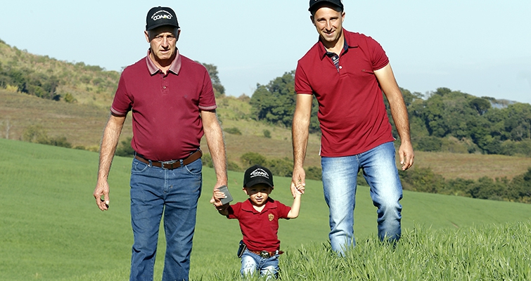 | Nei Renczeczen com o filho Cristiano e o neto Cristofer: trabalho, evolução e sucessão no campo são destaques na família de Pitanga (PR) |