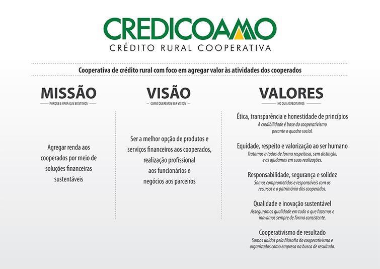 A missão da Credicoamo crédito rural cooperativa é agregar renda aos cooperados por meio de soluções financeiras sustentáveis. Foco que está enraizado na cooperativa desde sua origem em 17 de novembro de 1989, quando 29 produtores rurais decidiram inovar e garantir mais segurança ao homem do campo. Atualmente, com mais de 18 mil associados, a Credicoamo está presente nos Estados do Paraná, Santa Catarina e Mato Grosso do Sul e conta com linhas exclusivas de produtos e serviços, assim como disponibiliza assistência financeira com o propósito de fomentar a produção, a produtividade e a comercialização.