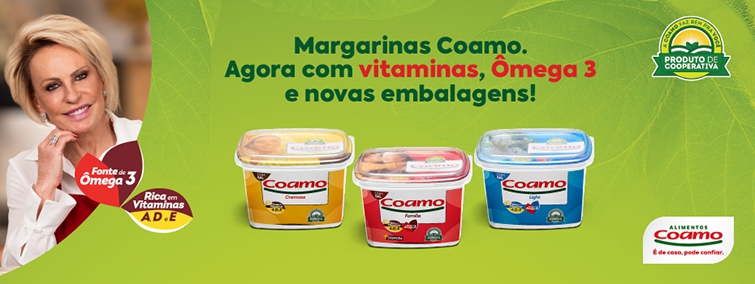 A linha de margarinas da Coamo, consagrada e bem conceituada pelos consumidores, está com novo visual. Para divulgar essa novidade a Coamo mais uma vez conta com a sua embaixadora Ana Maria Braga, que desta vez não está sozinha. A segunda fase da campanha apresenta também participantes da cadeia produtiva, desde aqueles que trabalham no campo, passando pelo processo de fabricação até a mesa de milhares de brasileiros. Isso mostra o quanto os produtos desenvolvidos pela cooperativa são mais saudáveis. Ainda mais com a nova fórmula das Margarinas Coamo, que agora vem com vitaminas e Ômega 3.