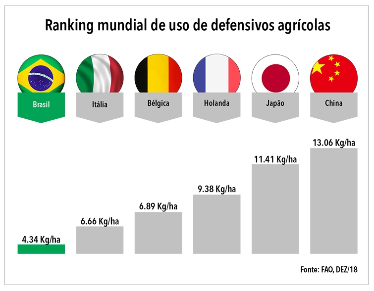 Segundo a Organização das Nações Unidas para a Alimentação (FAO), mesmo sendo um país tropical, o Brasil usa menos agrotóxicos, em relação à área cultivada, do que o Japão, país conhecido pela longevidade do seu povo. Os produtores rurais, na verdade, são os que mais buscam a economia no uso de defensivos agrícolas. A cada aplicação que deixa de ser feita em uma lavoura há um ganho financeiro significativo, além de todo o ganho ambiental e outros benefícios intangíveis.