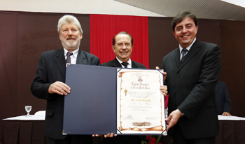 RESGATE - O vereador Célio Souza foi o autor da proposição da Comenda do Mérito Profissional a Gallassini, e orgulhoso, relata a satisfação do Poder Legislativo brusquense em outorgar a honraria. “É uma alegria muito grande para todos nós que em uma noite ímpar e de grande repercussão, entregamos esta comenda e resgatamos uma dívida com um filho de Brusque que é tão importante para a cidade e o país. É daqui de Brusque uma das maiores lideranças da agroindústria brasileira, reconhecido como o grande responsável pela transformação da cooperativa Coamo na potência que é atualmente.” Segundo ele, a entrega desta Comenda a uma pessoa simples, humilde, empreendedora e visionária também faz com que perpetue a história e mostra as novas gerações bons exemplos de brusquenses que foram conquistar admiração e sucesso em outras regiões. “Brusque sente-se orgulhosa em ter o Dr. Aroldo Gallassini como o mais novo Comendador”, considera Souza.