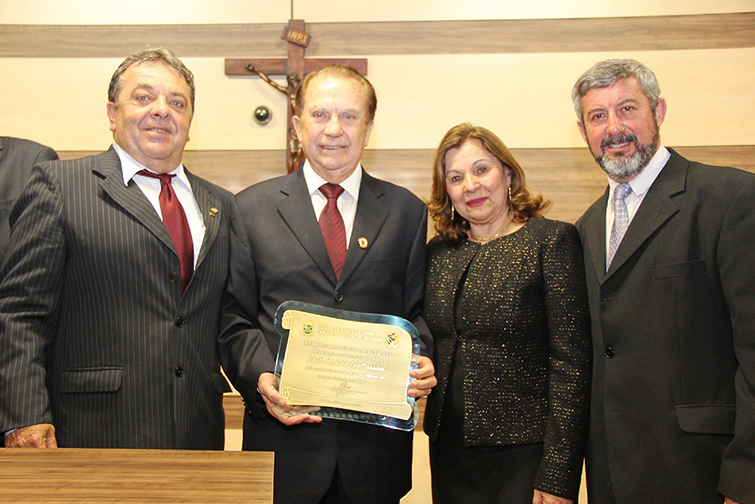 Célio Souza, autor da proposição da Comenda, Dr. Aroldo, dona Marli Gallassini e Guilherme Marchewsky, presidente da Câmara