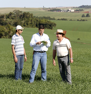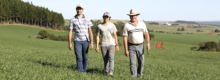 Carlos Vinícius Precinotto, encarregado do Detec da Coamo em Pitanga, analisa lavoura com os cooperados Fernando e Arlindo Romitti