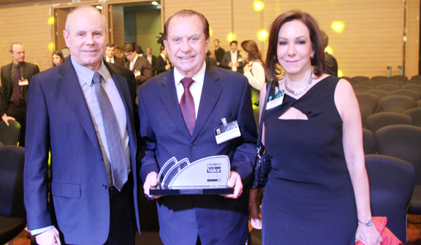 Dr. Aroldo ladeado pelo ministro da Fazenda, Guido Mantega e Vera Brandimarte, diretoria executiva de redação do Jornal Valor Econômico