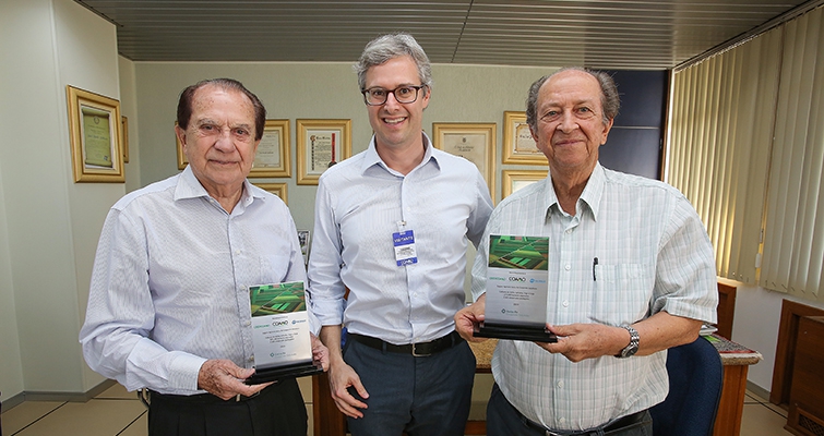 | Luciano Calheiros com o presidente da Coamo, José Aroldo Gallassini e o diretor-secretário Ricardo Accioly Calderari, em recente visita à cooperativa |