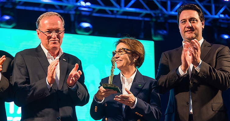A ministra da Agricultura, Tereza Cristina, foi homenageada no encontro com o Troféu Ocepar, entregue pelo presidente do Sistema Ocepar, José Roberto Ricken, junto com os diretores da entidade. “É uma honra receber essa homenagem da Ocepar”, disse a ministra. “É o reconhecimento à sua dedicação em defesa da agropecuária brasileira no exterior e seu empenho para que haja as condições ideais de tecnologia e sanidade, para que o nosso produto mereça a confiança dos consumidores em todo o mundo. Também estamos homenageando a ministra por seu empenho em relação ao Plano Safra 2019/20, com atuação muito forte em defesa do crédito rural junto ao Ministério da Economia e Banco Central”, destacou Ricken.