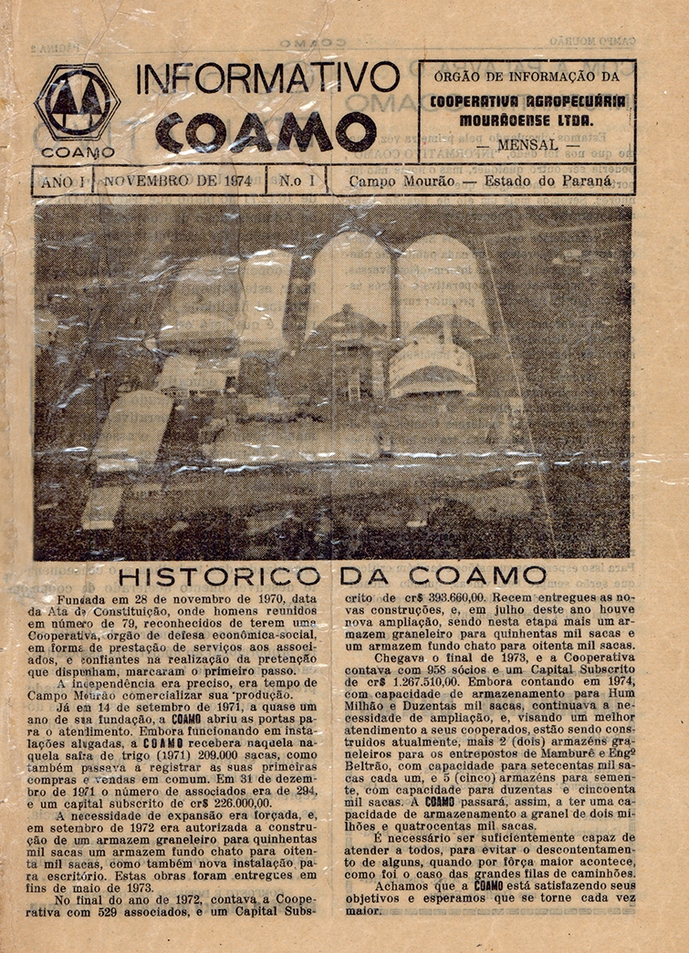 “O nome não importa, e sim a mensagem que chegará até os Senhores. Seremos mais um elo entre a Cooperativa e os Cooperados”, constava no primeiro dos cinco parágrafos do Editorial inaugural da primeira publicação que circulou em novembro de 1974 com o nome de Informativo Coamo. Esse foi o início da comunicação impressa na cooperativa. Comunicação que já tem 45 anos de existência e que neste mês de março alcançou marca histórica de 500 edições.