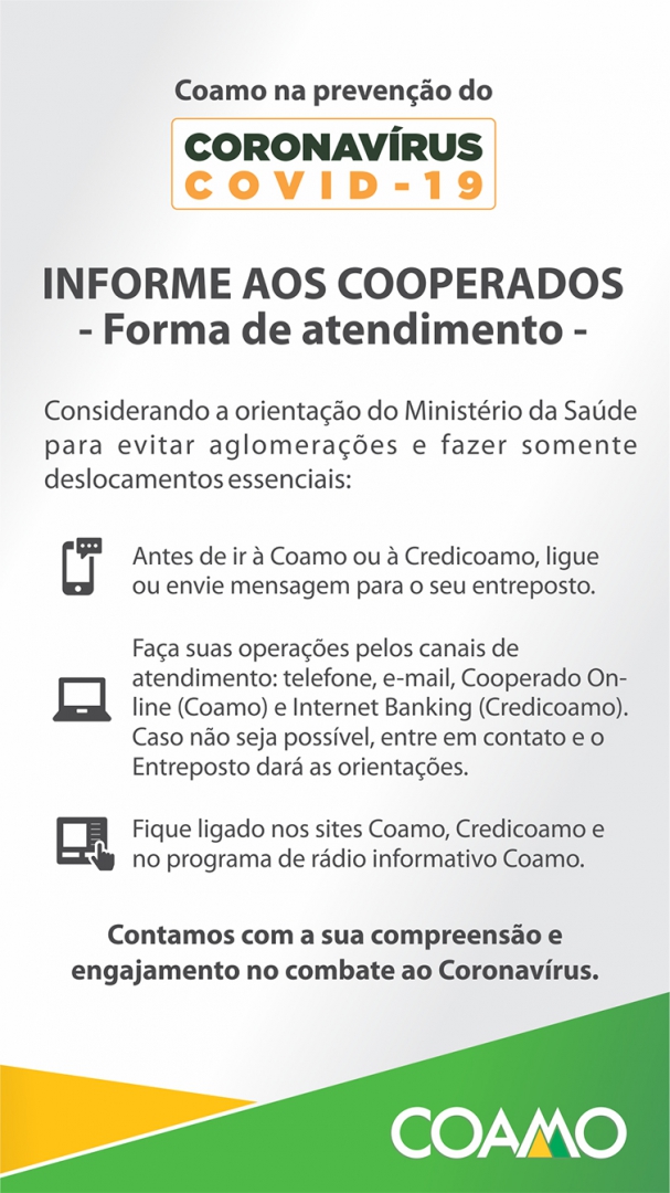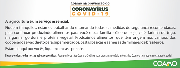 Considerando a declaração de pandemia para o Coronavírus, pela Organização Mundial da Saúde (OMS), dia 11 de março, que está afetando todos os setores do mercado mundial, a Coamo e a Credicoamo sensibilizadas com a situação, formaram o Comitê de Prevenção ao Coronavírus.