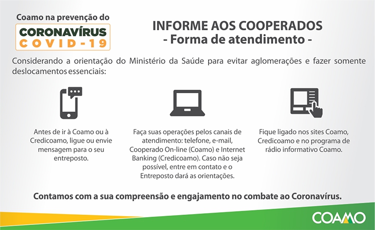 A campanha desenvolvida pela Coamo e Credicoamo visando evitar a aglomeração e a circulação dos cooperados nos entrepostos neste momento de combate ao coronavírus está sendo positiva e atendendo as orientações do Ministério da Saúde (MS).