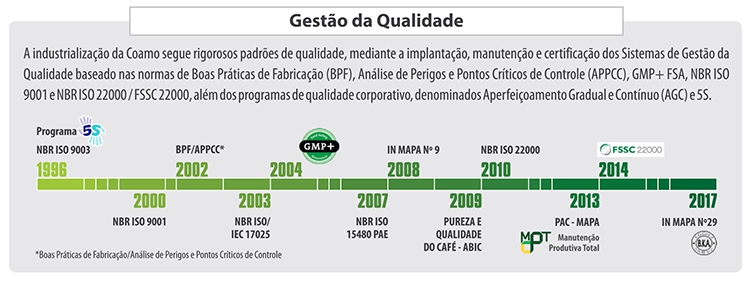 Os produtos Coamo são comercializados nos mercados interno e externo, com qualidade reconhecida, graças à observância de rigorosos padrões de controle de produção, como os programas ISO 9000, BPF/APPCC, sistemas certificados internacionalmente para segurança alimentar.