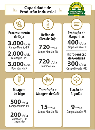 Do parque industrial saem os Alimentos Coamo, por meio das marcas Coamo, Primê, Anniela e Sollus. Com a aplicação dos critérios de sustentabilidade, os Alimentos Coamo primam pela qualidade e sabor, além de obedecerem a todas as boas práticas de produção. Com a soma desses fatores se destacam em vendas nas redes de atacados, supermercados e mercearias do Paraná e dos principais estados brasileiros.
