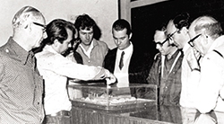 | Ao lado, Gallassini e Fioravante João Ferri, maquete da indústria de óleo e, acima, imagens dos primeiros anos do Parque Industrial, em Campo Mourão |