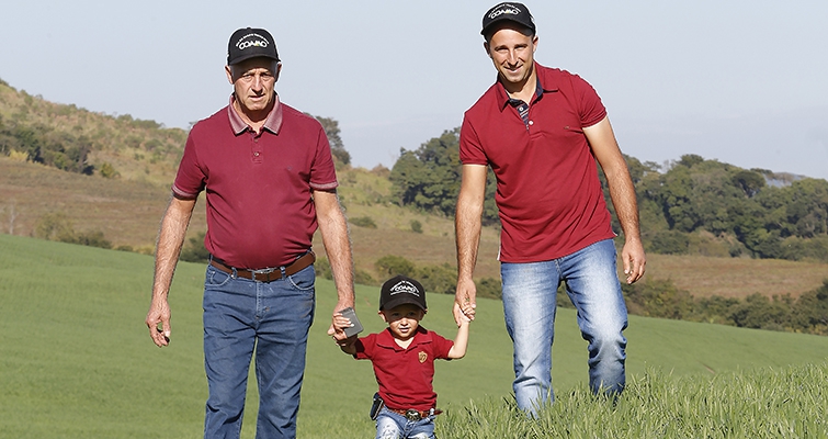 | Nei Renczeczen com o filho Cristiano e o neto Cristofer: trabalho, evolução e sucessão no campo são destaques na família de Pitanga (PR) |