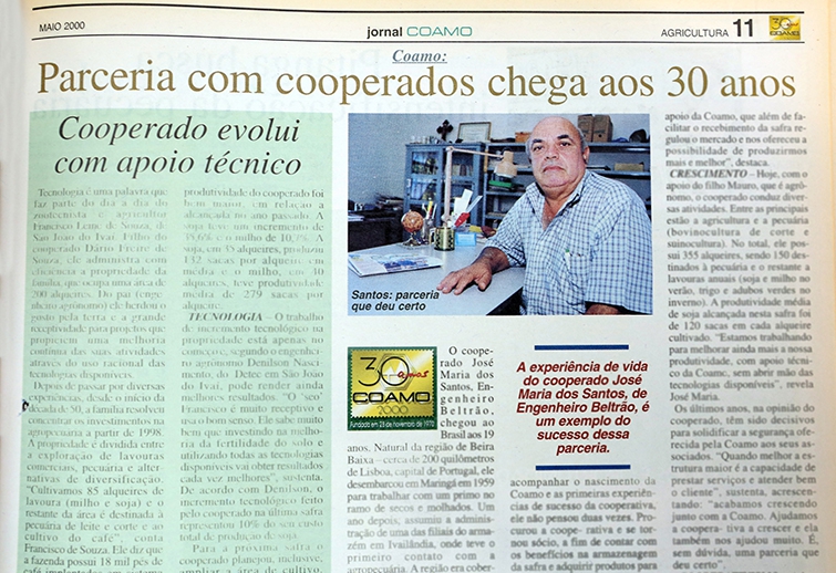 O cooperado José Maria dos Santos, de Engenheiro Beltrão (Centro-Oeste do Paraná), chegou ao Brasil aos 20 anos. Natural da região de Beira Baixa - cerca de 200 quilômetros de Lisboa, capital de Portugal, ele desembarcou em Maringá em 1959 para trabalhar com um primo no ramo de secos e molhados. Um ano depois, assumiu a administração de uma das filiais do armazém em Ivailândia (distrito de Engenheiro Beltrão), onde teve o primeiro contato com a agropecuária. A região era coberta por matas e cultivo de café e hortelã.