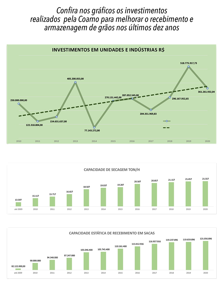 Para se ter uma ideia desse trabalho, a gerência de Engenharia da Coamo fez um levantamento dos investimentos realizados nos últimos dez anos. Foram mais de R$ 1.89 bilhões empregados em unidades. Se acrescentar os investimentos realizados nas indústrias, esse valor sobe para R$ 2.94 bilhões nos últimos dez anos.