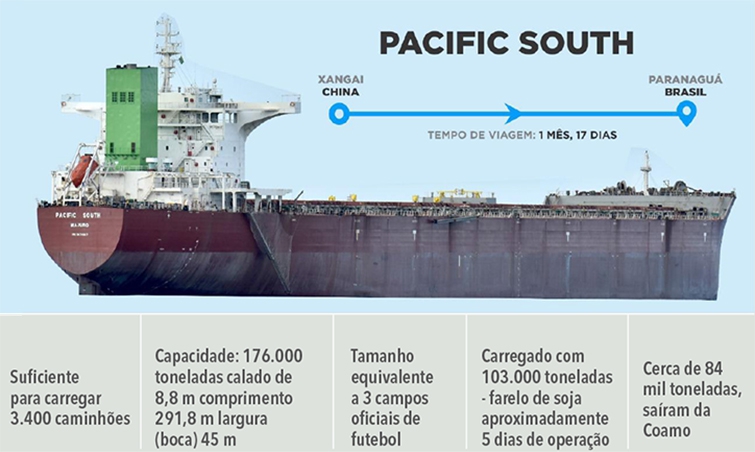 De bandeira das Ilhas Marshall, o navio Pacific South veio do porto de Xangai, na China, e atracou no Porto de Paranaguá no dia 08 de junho. Segundo a empresa responsável pela operação, o carregamento levou cerca de cinco dias. O farelo foi para o porto de Amsterdã, na Holanda.