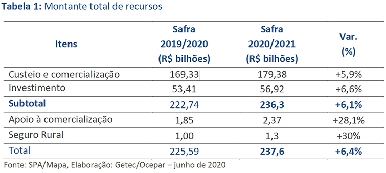 O governo federal anunciou, no dia 17 de junho, R$ 236,3 bilhões em recursos para o Plano Safra 2020/2021, valor 6,1% superior aos R$ 223 bilhões disponibilizados no ciclo passado.