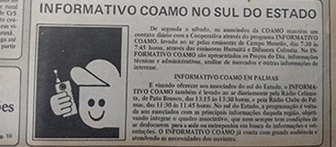 INFORMATIVO COAMO: A informação e transparência aos cooperados sempre foi objetivo da diretoria da cooperativa. E um dos canais para chegar ao quadro social era o rádio, por meio do programa Informativo Coamo apresentado nas manhãs de segunda a sábado, inicialmente pelas rádios Colméia e Humaitá, em Campo Mourão, e depois ampliado para várias regiões da área de ação.