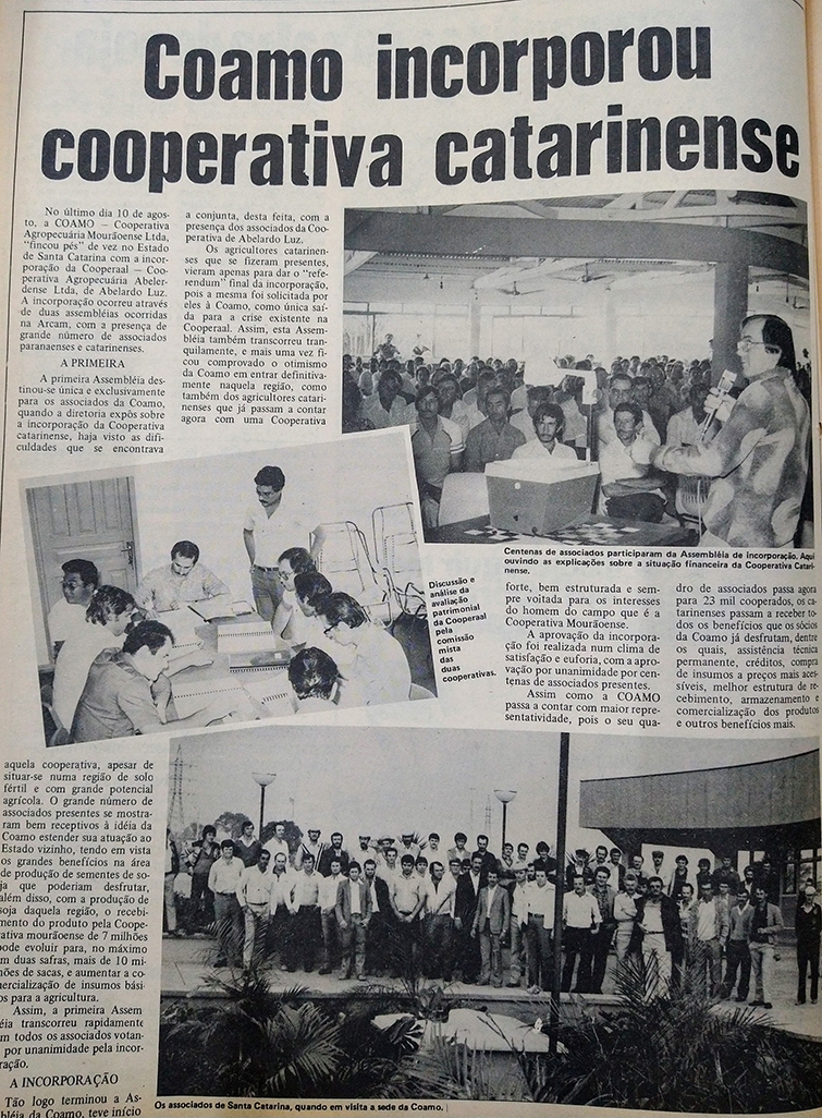CHEGADA A SC: No dia 10 de agosto, a Coamo “fincou os pés” em Santa Catarina, com a incorporação da Cooperal - Cooperativa de Abelardo Luz. A incorporação foi comemorada pelos agricultores e realizada com satisfação e euforia em duas assembleias com aprovação unânime dos associados. E 60 dias após, os catarinenses já contavam com uma loja de peças da cooperativa para ampliar o leque dos benefícios.