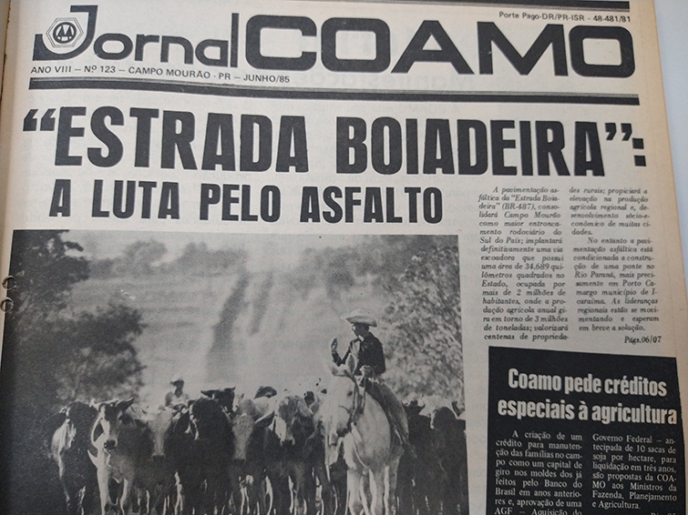 LUTA PELA REGIÃO: Estrada Boiadeira: a luta pelo asfalto” foi capa do Jornal Coamo, em edição que mostrava a esperança dos agricultores pla pavimentação asfáltica que consolidaria Campo Mourão como o maior entrocamento rodoviário do Sul do Brasil e uma importante via escoadora de produção.