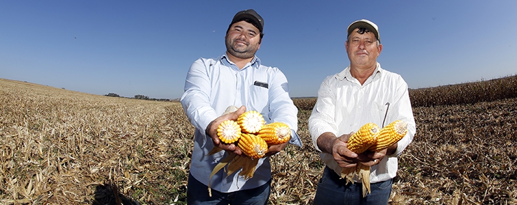 | Marcos Vinicius com o pai Milton Pereira Vieira, cooperados em Fênix (PR), estão tendo bons resultados com o milho |