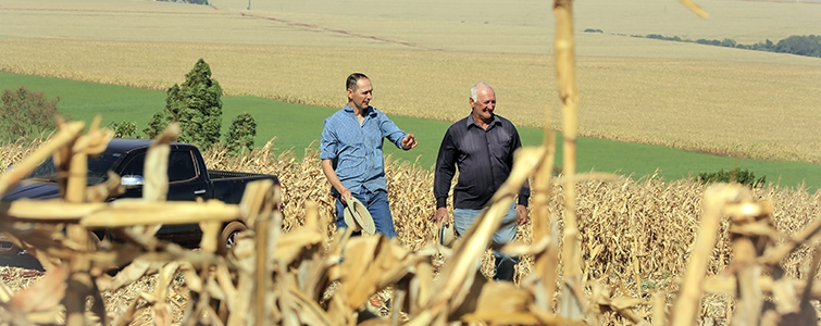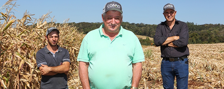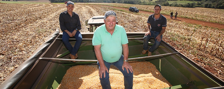 Quando recebeu a reportagem da Revista Coamo em sua propriedade, o cooperado Vilson Francisco Bernardi acompanhava com os dois filhos, Jeferson e Juliano, o final da colheita da segunda safra de milho. A área fica na comunidade São Francisco, em São Pedro do Iguaçu (Oeste do Paraná). Local que a família chegou, em 1968. A primeira atividade foi um comércio de secos e molhados e com o resultado adquiriram terras e deram início à agricultura.
