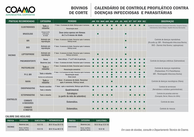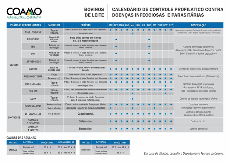 Para que o cooperado tenha suporte neste planejamento estratégico, Hérico revela que a Coamo elaborou um calendário para controle de doenças de acordo com cada região da cooperativa. “O associado só precisa ir até a unidade em que é atendido e solicitar o seu calendário, que está à disposição de todos. De posse do mesmo, ele vai planejar com o departamento técnico, e elencar as prioridades para ter o controle profilático correto das principais doenças que possam ocorrer e não ter o desempenho dos animais prejudicados.”